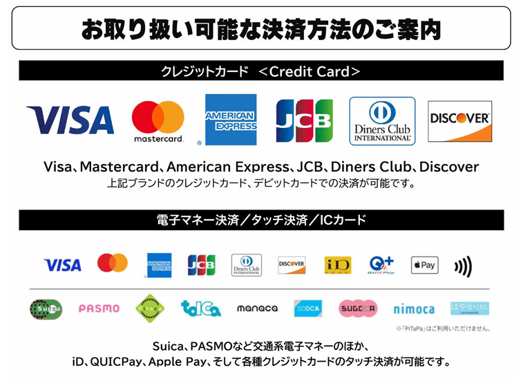 現金の他、クレジットカードや電子マネーもご利用いただけますが、当日のWi-Fi環境により決済にお時間をいただく場合もございますので、予めご了承ください。